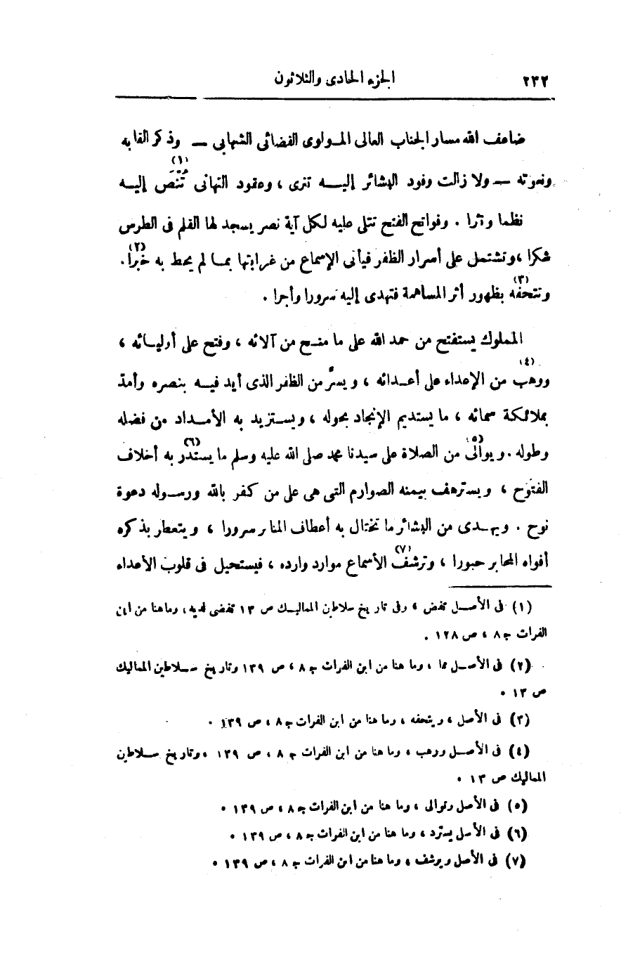 المملوك يستفتح من حمد الله على ما منح من آلائه، وفتح على أوليائه، ووهب «4» من الإعداء على أعدائه، ويسرّ من الظفر الذى أيد فيه بنصره وأمدّ بملائكة سمائه، ما يستديم الإنجاد بحوله، ويستزيد به الأمداد من فضله وطوله. ويوالى «5» من الصلاة على سيدنا محمد صلى الله عليه وسلم ما يستدر «6» به أخلاف الفتوح، ويسترهف بيمنه الصوارم التى هى على من كفر بالله ورسوله دعوة نوح. ويهدى من البشائر ما تختال به أعطاف المنابر سرورا، ويتعطر بذكره أفواه المحابر حبورا، وترشف «7» الأسماع موارد وارده، فيستحيل فى قلوب الأعداء