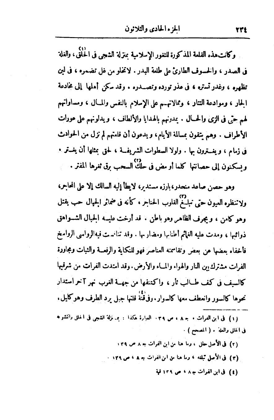 وهو حصن صاعد منحدر، بارزه مستدير، لا يطأ إليه السالك إلا على المحاجر، ولا تنظره العيون حتى تبلغ «3» القلوب الحناجر، كأنه فى ضمائر الجبال حب يقتل وهو كامن، ويجرف الظاهر وهو باطن. قد أرخت عليه الجبال الشواهق ذوائبها، ومدت عليه الغمائم أطنابها ومضاربها. وقد تنافست فيه الرواسى الرواسخ فأخفاه بعضها عن بعض وتقاسمته العناصر فهو للنكاية والرفعة والثبات ومجاورة الفرات مشترك بين النار والهواء والماء والأرض. وقد امتدت الفرات من شرقيها كالسيف فى كف طالب ثأر، واكتنفها من جهة الغرب نهر آخر استدار نحوها كالسور وانعطف معها كالسوار. وفى قنة «4» قلتها جبل يرد الطرف وهو كليل،
