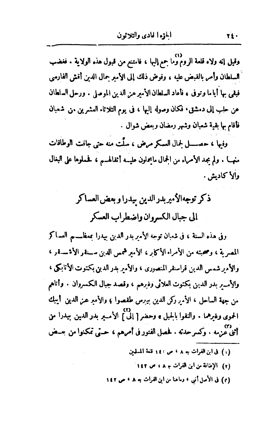 وفى هذه السنة، فى شعبان توجه الأمير بدر الدين بيدرا بمعظم العساكر المصرية، وصحبته من الأمراء الأكابر، الأمير شمس الدين سنقر الأشقر، والأمير شمس الدين قراسنقر المنصورى، والأمير بدر الدين بكتوت الأتابكى، والأمير بدر الدين بكتوت العلائى وغيرهم، وقصد جبال الكسروان. وأتاهم من جهة الساحل، الأمير ركن الدين بيبرس طقصوا؛ والأمير عز الدين أيبك الحموى وغيرهما. والتقوا بالجبل» وحضر [إلى] «2» الأمير بدر الدين بيدرا من أثنى «3» عزمه. وكسر حدته. فحصل الفتور فى أمرهم، حتى تمكنوا من بعض