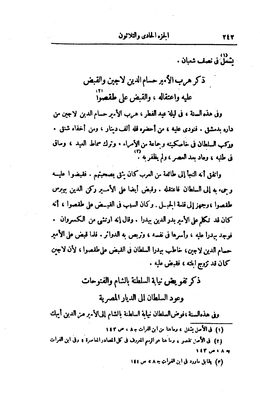 وفى هذه السنة، فى ليلة عيد الفطر، هرب الأمير حسام الدين لاجين من داره بدمشق. فنودى عليه، من أحضره فله ألف دينار، ومن أخفاه شنق.