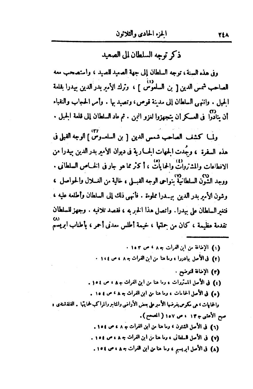 ولما كشف الصاحب شمس الدين [بن السلعوس] «3» الوجه القبلى فى هذه السفرة، وجدت الجهات الجارية فى ديوان الأمير بدر الدين بيدرا من الافطاعات والمشتروات «4» والحمايات «5» ، أكثر مما هو جار فى الخاص السلطانى.