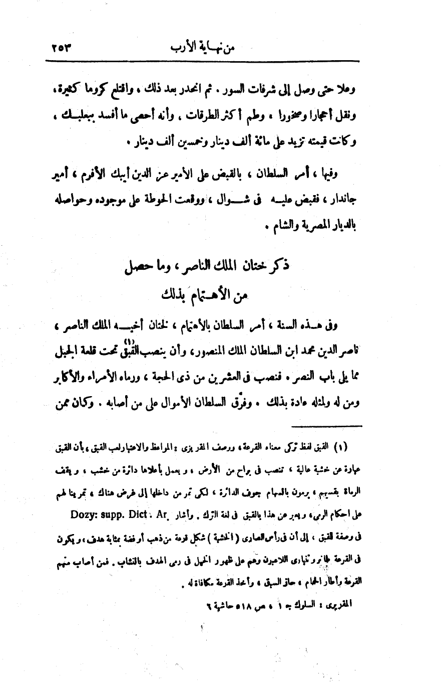 وفى هذه السنة، أمر السلطان بالأهتمام، لختان أخيه الملك الناصر، ناصر الدين محمد ابن السلطان الملك المنصور، وأن ينصب القبق «1» تحت قلعة الجبل مما يلى باب النصر. فنصب فى العشرين من ذى الحجة، ورماه الأمراء والأكابر ومن له ولمثله عادة بذلك. وفرّق السلطان الأموال على من أصابه. وكان ممن