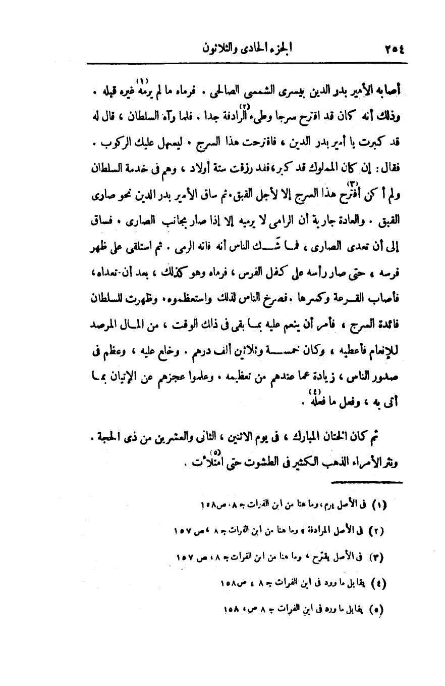 فقال: إن كان المملوك قد كبر، فقد رزقت ستة أولاد، وهم فى خدمة السلطان ولم أكن أفترح «3» هذا السرج إلا لأجل القبق، ثم ساق الأمير بدر الدين نحو صارى القبق. والعادة جارية أن الرامى لا يرميه إلا إذا صار بجانب الصارى، فساق إلى أن تعدى الصارى، فما شك الناس أنه فاته الرمى. ثم استلقى على ظهر فرسه، حتى صار رأسه على كفل الفرس، فرماه وهو كذلك، بعد أن تعداه، فأصاب القرعة وكسرها. فصرخ الناس لذلك واستعظموه. وظهرت للسلطان فائدة السرج، فأمر أن ينعم عليه بما بقى فى ذلك الوقت، من المال المرصد للإنعام فأعطيه، وكان خمسة وثلاثين ألف درهم. وخلع عليه، وعظم فى صدور الناس، زيادة عما عندهم من تعظيمه. وعلموا عجزهم عن الإتيان بما أتى به، وفعل ما فعله «4» ثم كان الختان المبارك، فى يوم الاثنين، الثانى والعشرين من ذى الحجة.