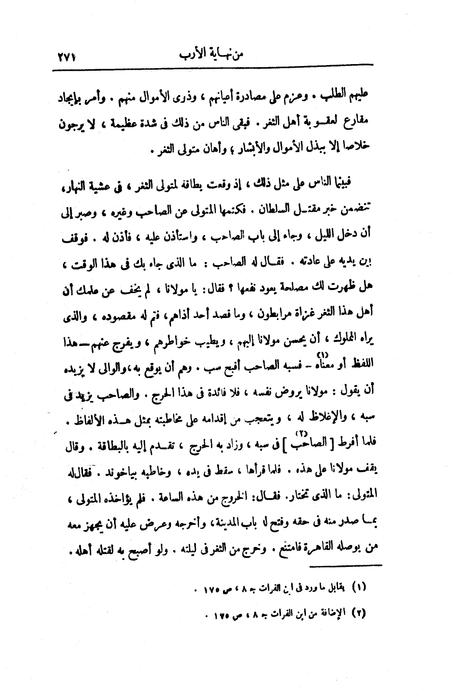فبينما الناس على مثل ذلك، إذ وقعت يطاقه لمتولى الثغر، فى عشية النهار، تنضمن خبر مقتل السلطان. فكتمها المتولى عن الصاحب وغيره، وصبر إلى أن دخل الليل، وجاء إلى باب الصاحب، واستأذن عليه، فأذن له. فوقف بين يديه على عادته. فقال له الصاحب: ما الذى جاء بك فى هذا الوقت، هل ظهرت لك مصلحة يعود نفعها؟ فقال: يا مولانا، لم يخف عن علمك أن أهل هذا الثغر غزاة مرابطون، وما قصد أحد أذاهم، فتم له مقصوده، والذى يراه المملوك، أن يحسن مولانا إليهم، ويطيب خواطرهم، ويفرج عنهم- هذا اللفظ أو معناه «1» - فسبه الصاحب أقبح سب. وهم أن يوقع به، والوالى لا يزيده أن يقول: مولانا يروض نفسه، فلا فائدة فى هذا الحرج. والصاحب يزيد فى سبه، والإغلاظ له، ويتعجب من إقدامه على مخاطبته بمثل هذه الألفاظ.