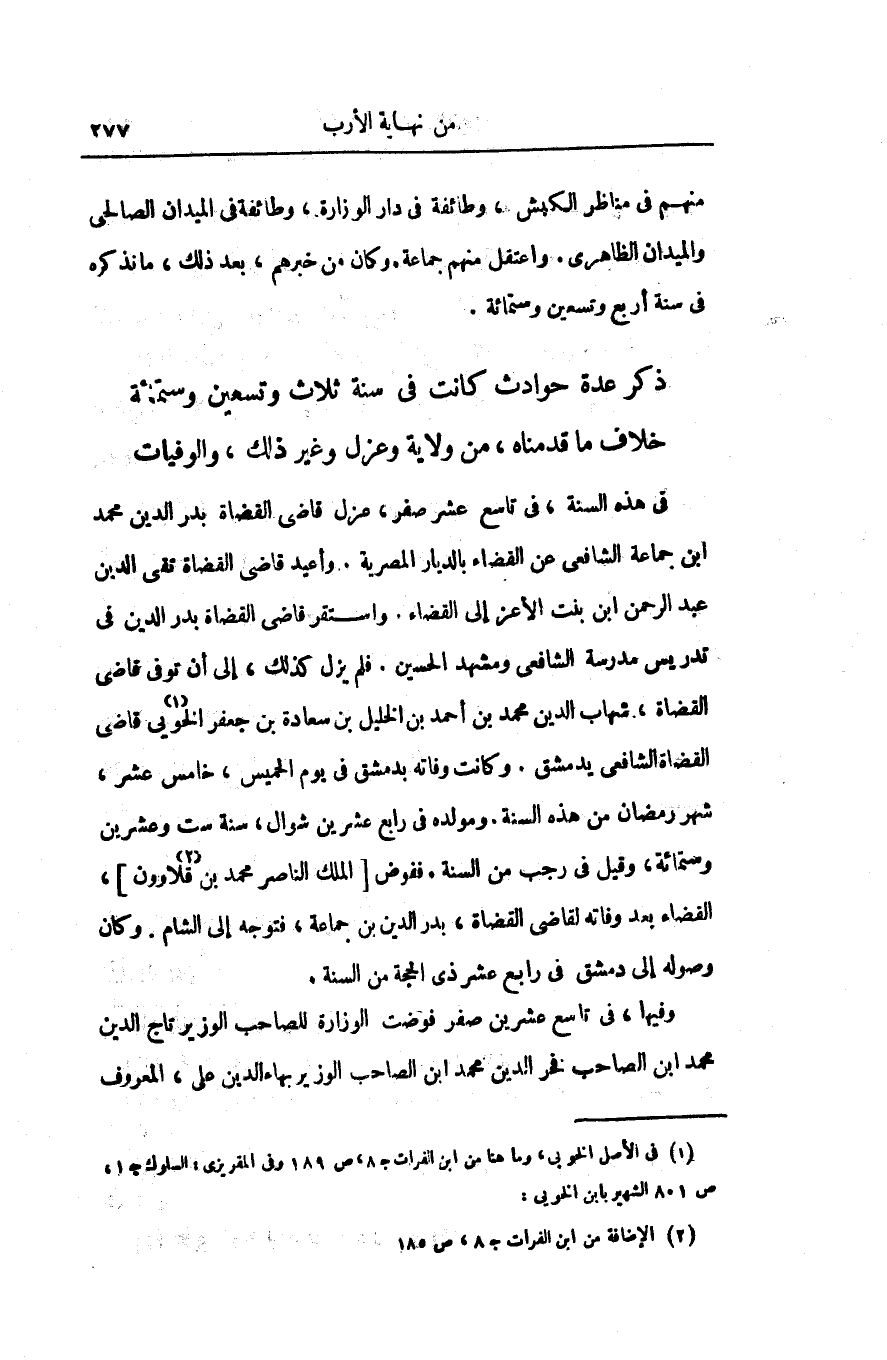 فى هذه السنة، فى تاسع عشر صفر، عزل قاضى القضاة بدر الدين محمد ابن جماعة الشافعى عن القضاء بالديار المصرية. وأعيد قاضى القضاة تقى الدين عبد الرحمن ابن بنت الأعز إلى القضاء. واستقر قاضى القضاة بدر الدين فى تدريس مدرسة الشافعى ومشهد الحسين. فلم يزل كذلك، إلى أن توفى قاضى القضاة، شهاب الدين محمد بن أحمد بن الخليل بن سعادة بن جعفر الخويى «1» قاضى القضاة الشافعى بدمشق. وكانت وفاته بدمشق فى يوم الخميس، خامس عشر، شهر رمضان من هذه السنة. ومولده فى رابع عشرين شوال، سنة ست وعشرين وستمائة، وقيل فى رجب من السنة. ففوض [الملك الناصر محمد بن «2» قلاوون] ، القضاء بعد وفاته لقاضى القضاة، بدر الدين بن جماعة، فتوجه إلى الشام. وكان وصوله إلى دمشق فى رابع عشر ذى الحجة من السنة.