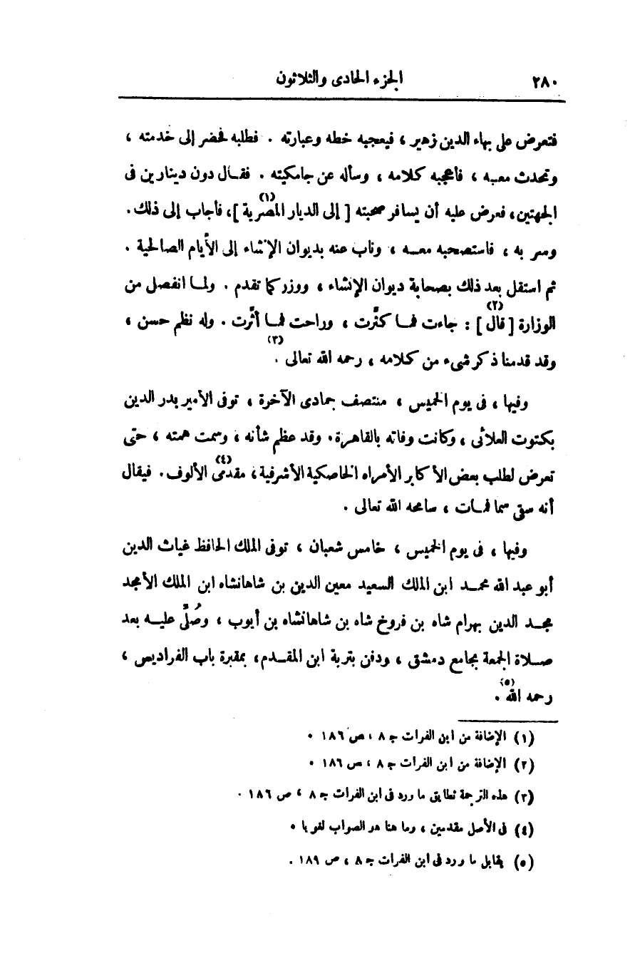فتعرض على بهاء الدين زهير، فيعجبه خطه وعبارته. فطلبه فحضر إلى خدمته، وتحدث معبه، فأعجبه كلامه، وسأله عن جامكيته. فقال دون دينارين فى الجهتين، فعرض عليه أن يسافر صحبته [إلى الديار المصرية «1» ] ، فأجاب إلى ذلك.