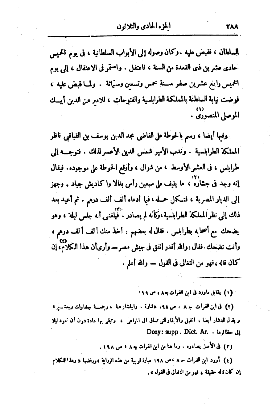 السلطان، فقبض عليه. وكان وصوله إلى الأبواب السلطانية، فى يوم الخميس حادى عشرين ذى القعدة من السنة، فاعتقل. واستمر فى الاعتقال، إلى يوم الخميس رابع عشرين صفر سنة خمس وتسعين وستمائة. ولما قبض عليه، فوضت نيابة السلطنة بالمملكة الطرابلسية والفتوحات، للامير عز الدين أيبك الموصلى المنصورى «1» .