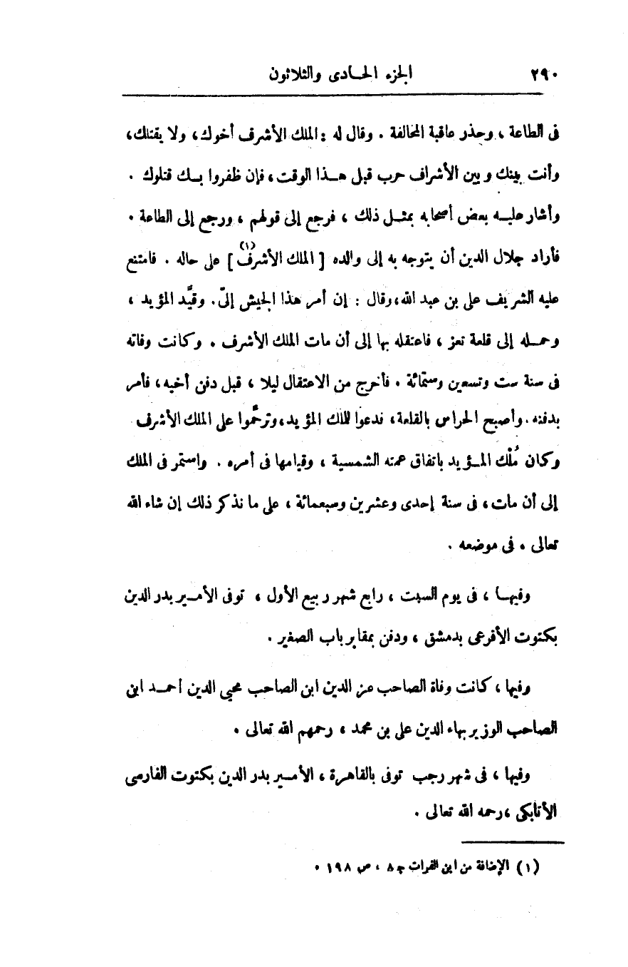 فأراد جلال الدين أن يتوجه به إلى والده [الملك الأشرف «1» ] على حاله. فامتنع عليه الشريف على بن عبد الله، وقال: إن أمر هذا الجيش إلىّ. وقيّد المؤيد، وحمله إلى قلعة تعز، فاعتقله بها إلى أن مات الملك الأشرف. وكانت وفاته فى سنة ست وتسعين وستمائة. فأخرج من الاعتقال ليلا، قبل دفن أخيه، فأمر بدفنه. وأصبح الحراس بالقلعة، فدعوا للملك المؤيد، وترحّموا على الملك الأشرف وكان ملك المؤيد باتفاق عمته الشمسية، وقيامها فى أمره. واستمر فى الملك إلى أن مات، فى سنة إحدى وعشرين وسبعمائة، على ما نذكر ذلك إن شاء الله تعالى. فى موضعه.