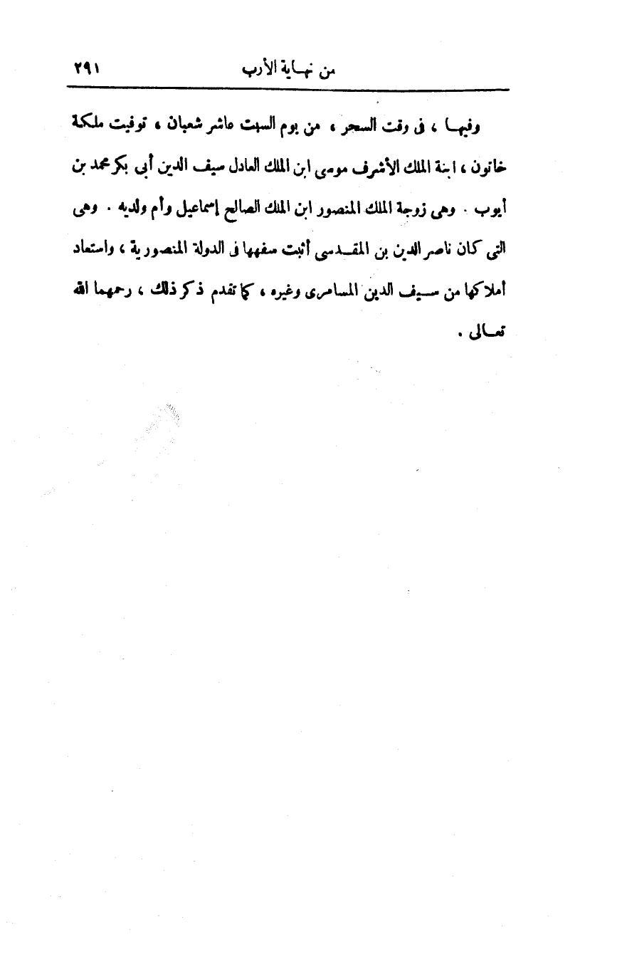 وفيها، فى وقت السحر، من يوم السبت عاشر شعبان، توفيت ملكة خاتون، ابنة الملك الأشرف موسى ابن الملك العادل سيف الدين أبى بكر محمد بن أيوب. وهى زوجة الملك المنصور ابن الملك الصالح إسماعيل وأم ولديه. وهى التى كان ناصر الدين بن المقدسى أثبت سفهها فى الدولة المنصورية، واستعاد أملاكها من سيف الدين المسامرى وغيره، كما تقدم ذكر ذلك، رحمهما الله تعالى.