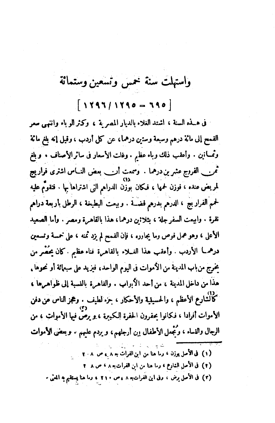 فى هذه السنة، اشتد الغلاء بالديار المصرية، وكثر الوباء وانتهى سعر القمح إلى مائة درهم وسبعة وستين درهما، عن كل أردب، وقيل إنه بلغ مائة وثمانين. وأعقب ذلك وباء عظيم. وغلت الأسعار فى سائر الأصناف. وبلغ ثمن الفروج عشرين درهما. وسمعت أن بعض الناس اشترى فراريج لمريض عنده، فوزن لحمها، فكان بوزن «1» الدراهم التى اشتراها بها. فتقوّم عليه لحمم الفراريج، الدرهم بدرهم فضة. وبيعت البطيخة، الرطل بأربعة دراهم نقرة. وابيعت السفر جلة، بثلاثين درهما، هذا بالقاهرة ومصر. وأما الصعيد الأعلى، وهو عمل فوص وما يجاوره، فإن القمح لم يزد ثمنه، على خمسة وتسعين درهما الأردب. وأعقب هذا الغلاء بالقاهرة فناء عظيم. كان يحصر من يخرج من باب المدينة من الأموات فى اليوم الواحد، فيزيد على سبعمائة أو نحوها، هذا من داخل المدينة، من أحد الأبواب. والقاهرة بالنسبة إلى ظواهرها، كالشارع «2» الأعظم، والحسينية والأحكار، جزء لطيف. وعجز الناس عن دفن الأموات أفرادا، فكانوا يحفرون الحفرة الكبيرة، ويرص «3» فيها الأموات، من الرجال والنساء، ويجعل الأطفال بين أرجلهم، ويردم عليهم. وبعض الأموات