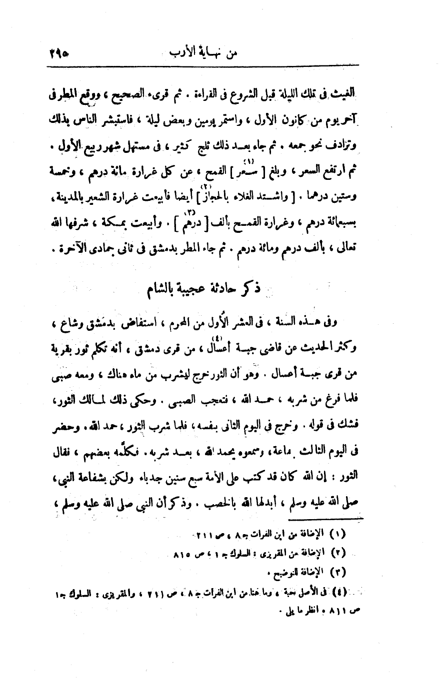 وفى هذه السنة، فى العشر الأول من المحرم، استفاض بدمشق وشاع، وكثر الحديث عن قاضى جبة أعسال «4» ، من قرى دمشق، أنه تكلم ثور بقرية من قرى جبة أعسال. وهو أن الثور خرج ليشرب من ماء هناك، ومعه صبى فلما فرغ من شربه، حمد الله، فتعجب الصبى. وحكى ذلك لمالك الثور، فشك فى قوله. وخرج فى اليوم الثانى بنفسه، فلما شرب الثور، حمد الله. وحضر فى اليوم الثالث جماعة، وسمعوه يحمد الله، بعد شربه. فكلّمه بعضهم، فقال الثور: إن الله كان قد كتب على الأمة سبع سنين جدباء ولكن بشفاعة النبى، صلى الله عليه وسلم، أبدلها الله بالخصب. وذكر أن النبى صلى الله عليه وسلم،
