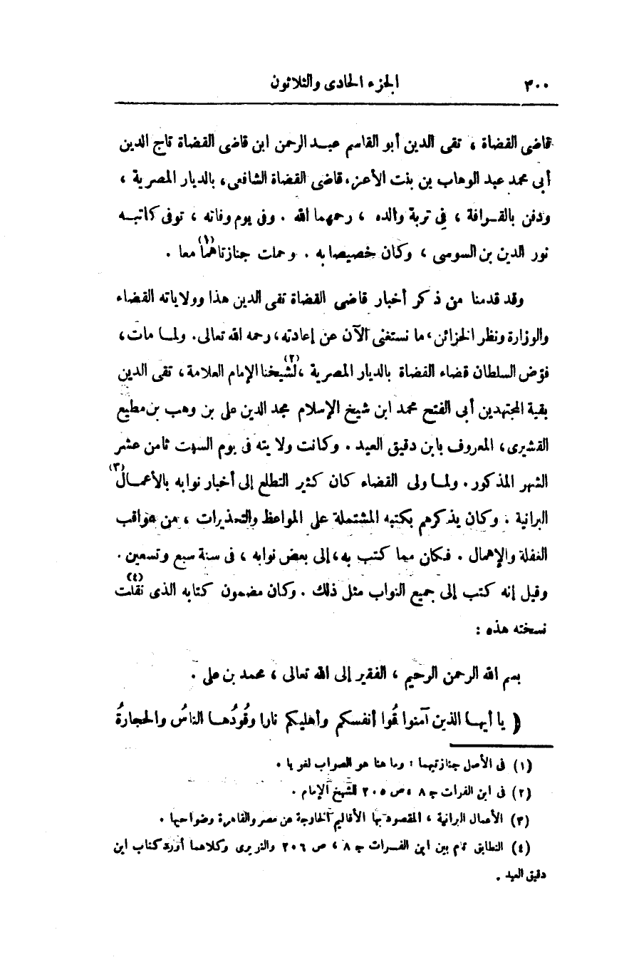وقد قدمنا من ذكر أخبار قاضى القضاة تقى الدين هذا وولاياته القضاء والوزارة ونظر الخزائن، ما نستغنى الآن عن إعادته، رحمه الله تعالى. ولما مات، فوّض السلطان قضاء القضاة بالديار المصرية، لشيخنا «2» الإمام العلامة، تقى الدين بقية المجتهدين أبى الفتح محمد ابن شيخ الإسلام مجد الدين على بن وهب بن مطيع القشيرى، المعروف بابن دقيق العيد. وكانت ولايته فى يوم السبت ثامن عشر الشهر المذكور. ولما ولى القضاء كان كثير التطلع إلى أخبار نوابه بالأعمال «3» البرانية. وكان يذكرهم بكتبه المشتملة على المواعظ والتحذيرات، من عواقب الغفلة والإهمال. فكان مما كتب به، إلى بعض نوابه، فى سنة سبع وتسعين.