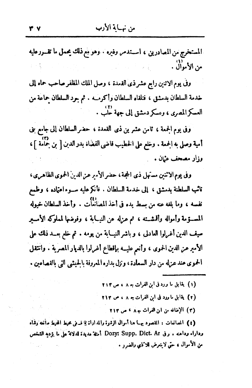 وفى يوم الجمعة، ثامن عشرين ذى القعدة، حضر السلطان إلى جامع بنى أمية وصلى به الجمعة. وخلع على الخطيب قاضى القضاة بدر الدين [بن جمامة «3» ] ، وزار مصحف عثمان.