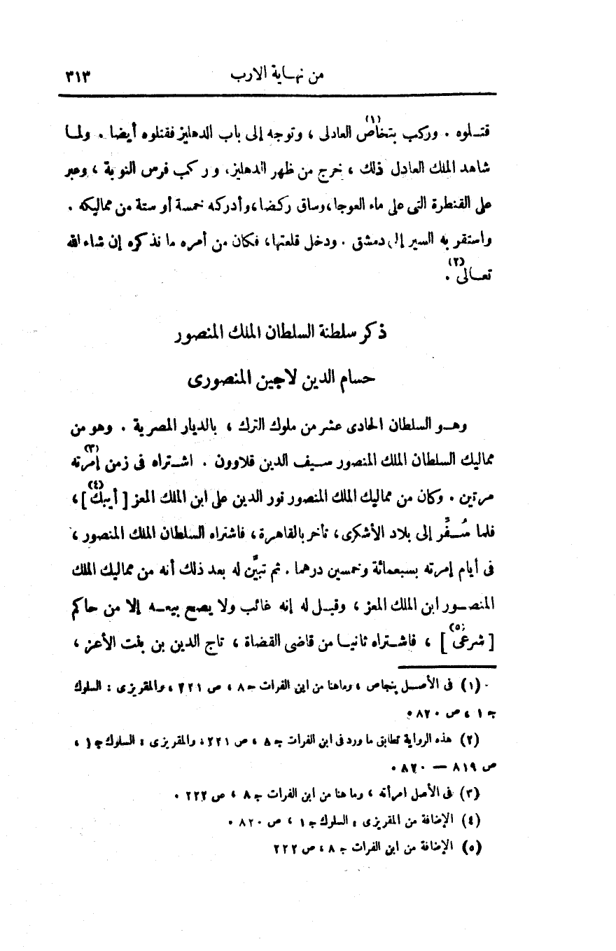 ذكر سلطنة السلطان الملك المنصور حسام الدين لاجين المنصورى وهو السلطان الحادى عشر من ملوك الترك، بالديار المصرية.