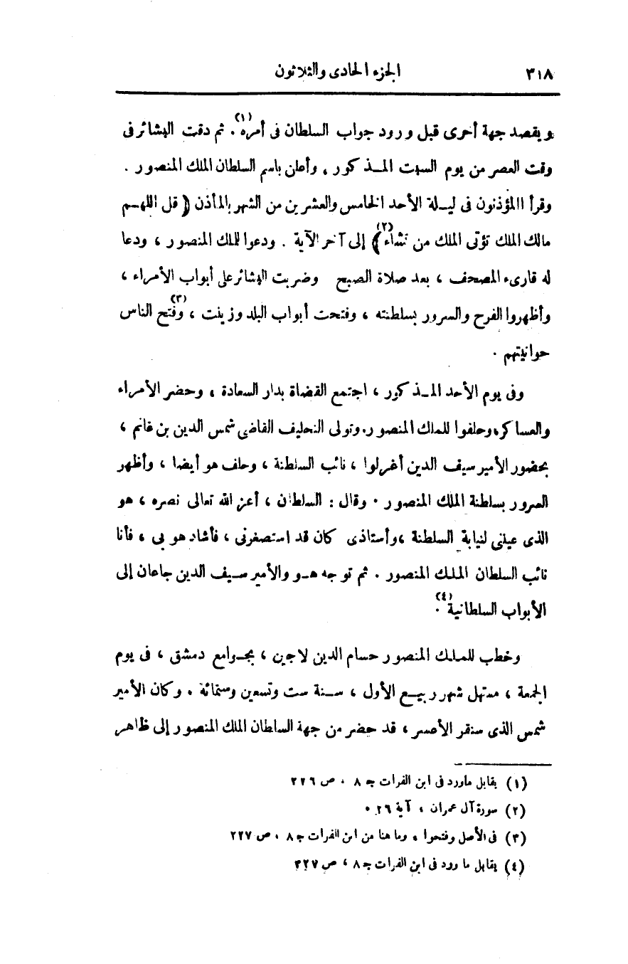 «2» إلى آخر الآية. ودعوا للملك المنصور، ودعا له قارىء المصحف، بعد صلاة الصبح وضربت البشائر على أبواب الأمراء، وأظهروا الفرح والسرور بسلطنته، وفتحت أبواب البلد وزينت، وفتح «3» الناس حوانيتهم.