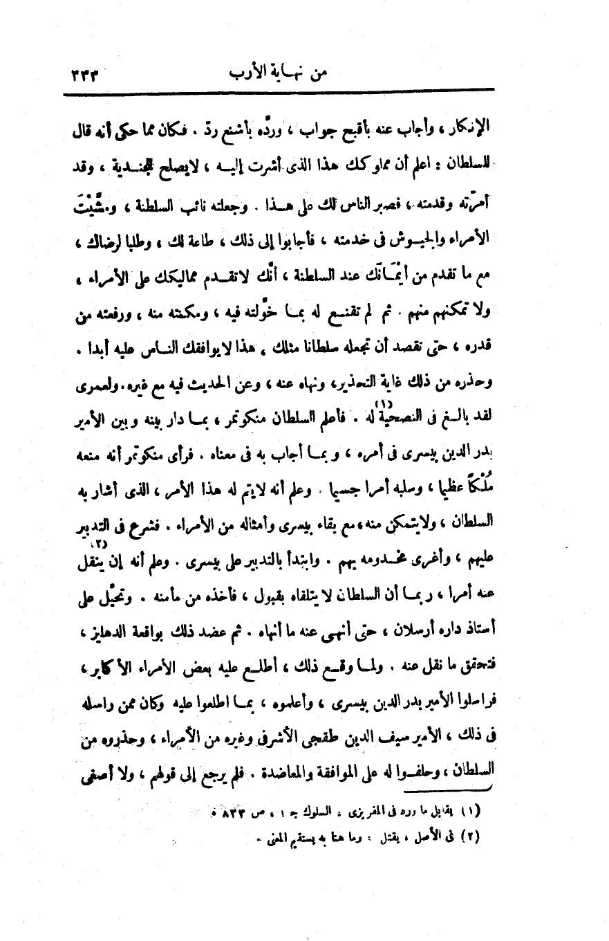 الإنكار، وأجاب عنه بأقبح جواب، وردّه بأشنع ردّ. فكان مما حكى أنه قال للسلطان: أعلم أن مملوكك هذا الذى أشرت إليه، لا يصلح للجندية، وقد أمرّته وقدمته، فصبر الناس لك على هذا. وجعلته نائب السلطنة، ومشيّت الأمراء والجيوش فى خدمته، فأجابوا إلى ذلك، طاعة لك، وطلبا لرضاك، مع ما تقدم من أيمانك عند السلطنة، أنّك لا تقدم مماليكك على الأمراء، ولا تمكنهم منهم. ثم لم تقنع له بما خوّلته فيه، ومكنته منه، ورفعته من قدره، حتى نقصد أن تجعله سلطانا مثلك، هذا لا يوافقك الناس عليه أبدا.