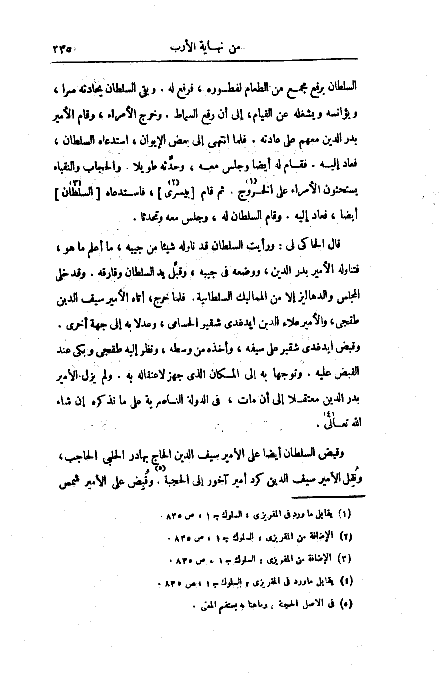 السلطان برفع مجمع من الطعام لفطوره، فرفع له. وبقى السلطان يحادثه سرا، ويؤانسه ويشغله عن القيام، إلى أن رفع السماط. وخرج الأمراء، وقام الأمير بدر الدين معهم على عادته. فلما انتهى إلى بعض الإيوان، استدعاء السلطان، فعاد إليه. فقام له أيضا وجلس معه، وحدّثه طويلا. والحجاب والنقباء يستحثون الأمراء على الخروج «1» . ثم قام [بيسرى] «2» ، فاستدعاه [السلطان] «3» أيضا، فعاد إليه. وقام السلطان له، وجلس معه وتحدثا.