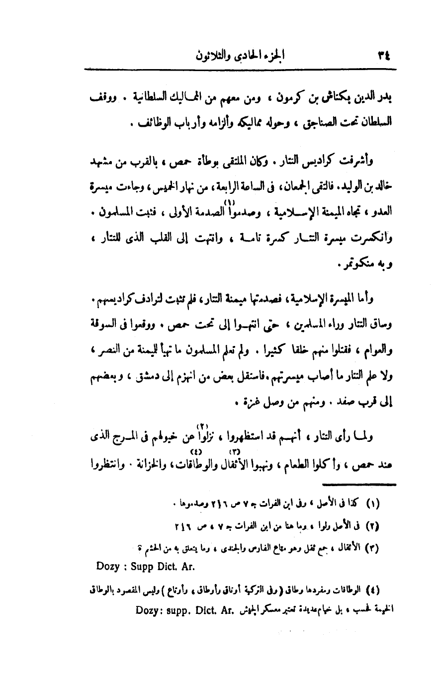 ولما رأى التتار، أنهم قد استظهروا، نزلوا «2» عن خيولهم فى المرج الذى عند حمص، وأكلوا الطعام، ونهبوا الأثقال «3» والوطاقات «4» ، والخزانة. وانتظروا
