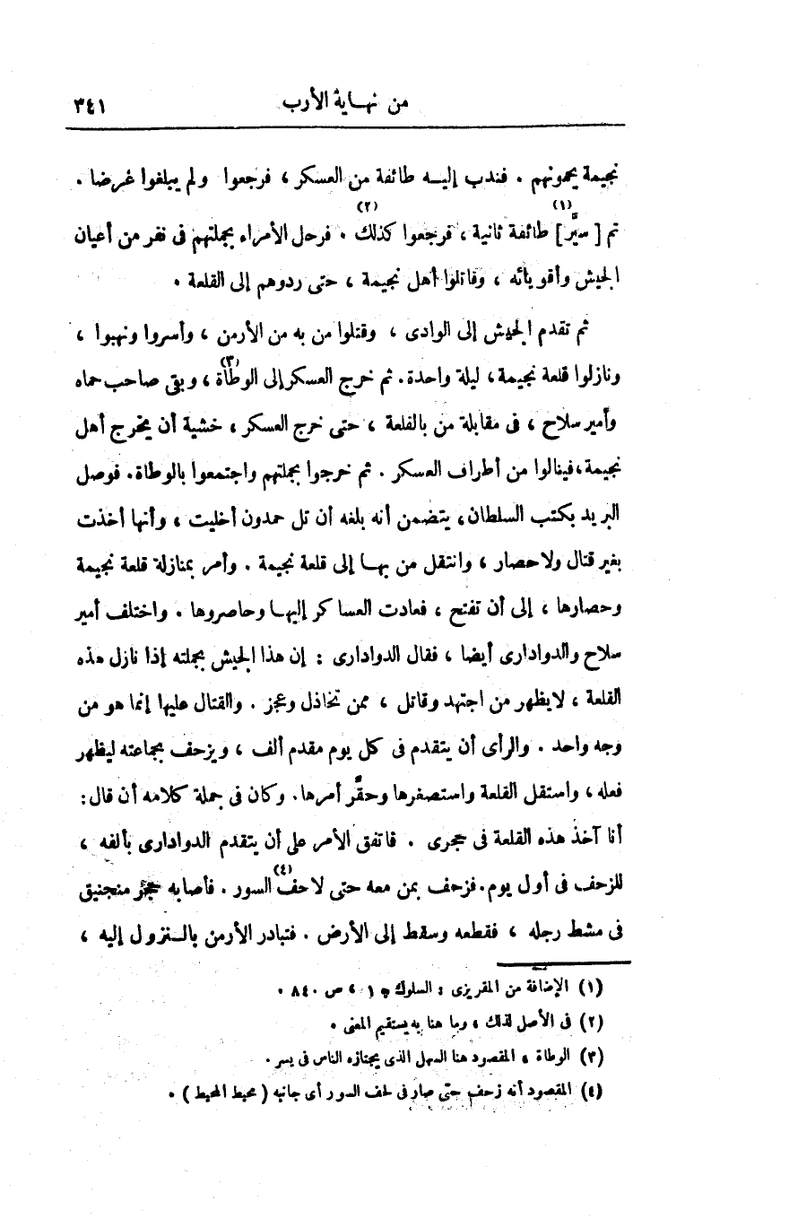 ثم تقدم الجيش إلى الوادى، وقتلوا من به من الأرمن، وأسروا ونهبوا، ونازلوا قلعة نجيمة، ليلة واحدة. ثم خرج العسكر إلى الوطاة «3» ، وبقى صاحب حماه وأمير سلاح، فى مقابلة من بالقلعة، حتى خرج العسكر، خشية أن يخرج أهل نجيمة، فينالوا من أطراف العسكر. ثم خرجوا بجملتهم واجتمعوا بالوطاة. فوصل البريد بكتب السلطان، يتضمن أنه بلغه أن تل حمدون أخليت، وأنها أخذت بغير قتال ولا حصار، وانتقل من بها إلى قلعة نجيمة. وأمر بمنازلة قلعة نجيمة وحصارها، إلى أن تفتح، فعادت العساكر إليها وحاصروها. واختلف أمير سلاح والدوادارى أيضا، فقال الدوادارى: إن هذا الجيش بجملته إذا نازل هذه القلعة، لا يظهر من اجتهد وقاتل، ممن تخاذل وعجز. والقتال عليها إنما هو من وجه واحد. والرأى أن يتقدم فى كل يوم مقدم ألف، ويزحف بجماعته ليظهر فعله، واستقل القلعة واستصغرها وحقّر أمرها. وكان فى جملة كلامه أن قال: