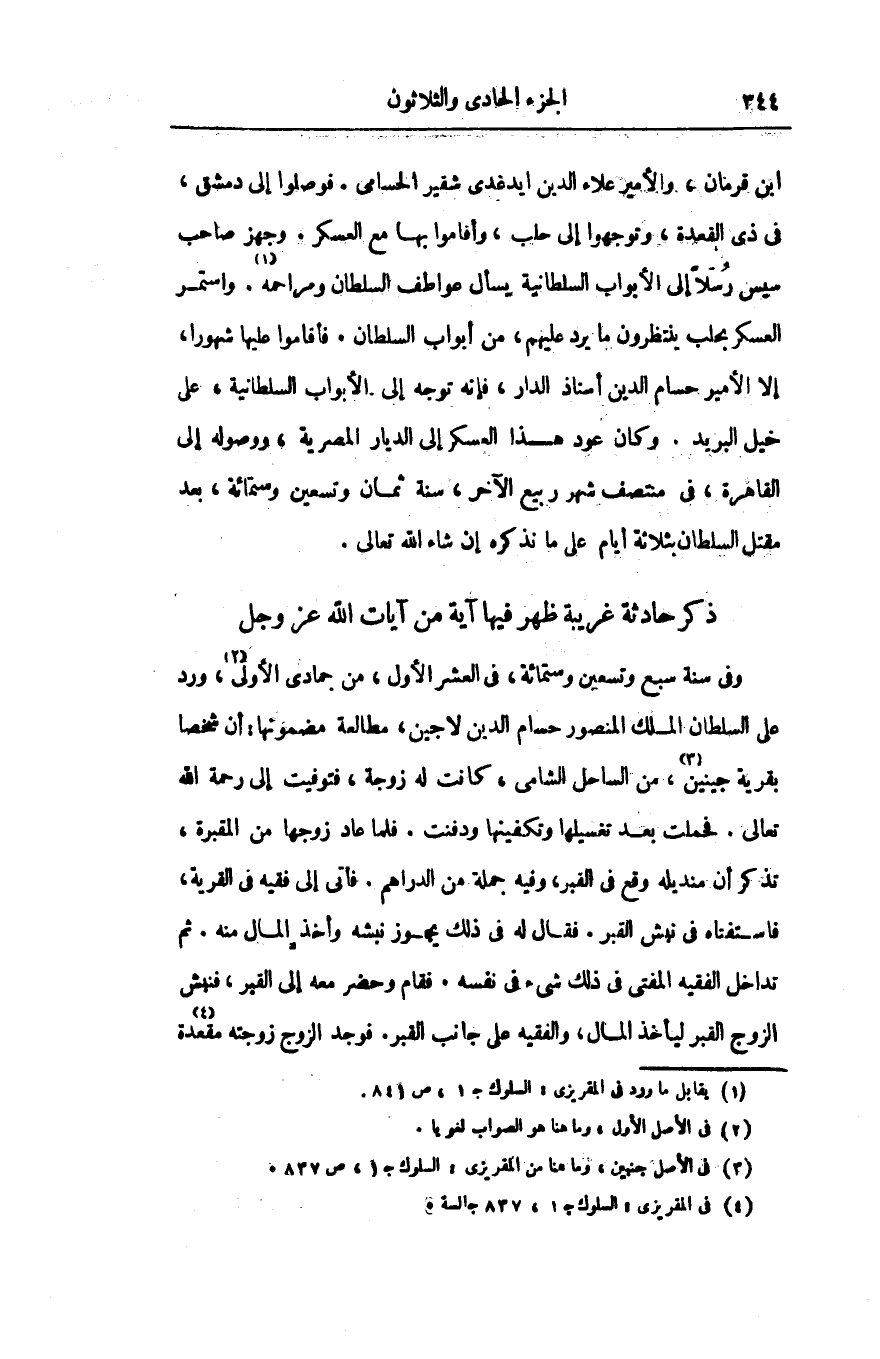 وفى سنة سبع وتسعين وستمائة، فى العشر الأول، من جمادى الأولى «2» ، ورد على السلطان الملك المنصور حسام الدين لاجين، مطالعة مضمونها: أن شخصا بقرية جينين «3» ، من الساحل الشامى، كانت له زوجة، فتوفيت إلى رحمة الله تعالى. فحملت بعد تغسيلها وتكفينها ودفنت. فلما عاد زوجها من المقبرة، تذكر أن منديله وقع فى القبر، وفيه جملة من الدراهم. فأتى إلى فقيه فى القرية، فاستفناء ف نبش القبر. فقال له فى ذلك يجوز نبشه وأخذ المال منه. ثم تداخل الفقيه المفتى فى ذلك شىء فى نفسه. فقام وحضر معه إلى القبر، فنبش الزوج القبر ليأخذ المال، والفقيه على جانب القبر. فوجد الزوج زوجته مقعدة «4»