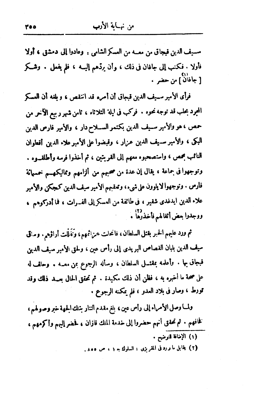 ثم ورد عليهم الخبر بقتل السلطان، فانحلت عزائمهم، وتفلّلت أراؤهم. وساق سيف الدين بلبان القصاص البريدى إلى رأس عين، ولحق الأمير سيف الدين قبجاق بها. وأعلمه بمقتل السلطان، وسأله الرجوع بمن معه. وحلف له على صحة ما أخبره به، فظن أن ذلك مكيدة. ثم تحقق الحال بعد ذلك وقد تورط، وصار فى بلاد العدو، فلم يمكنه الرجوع.