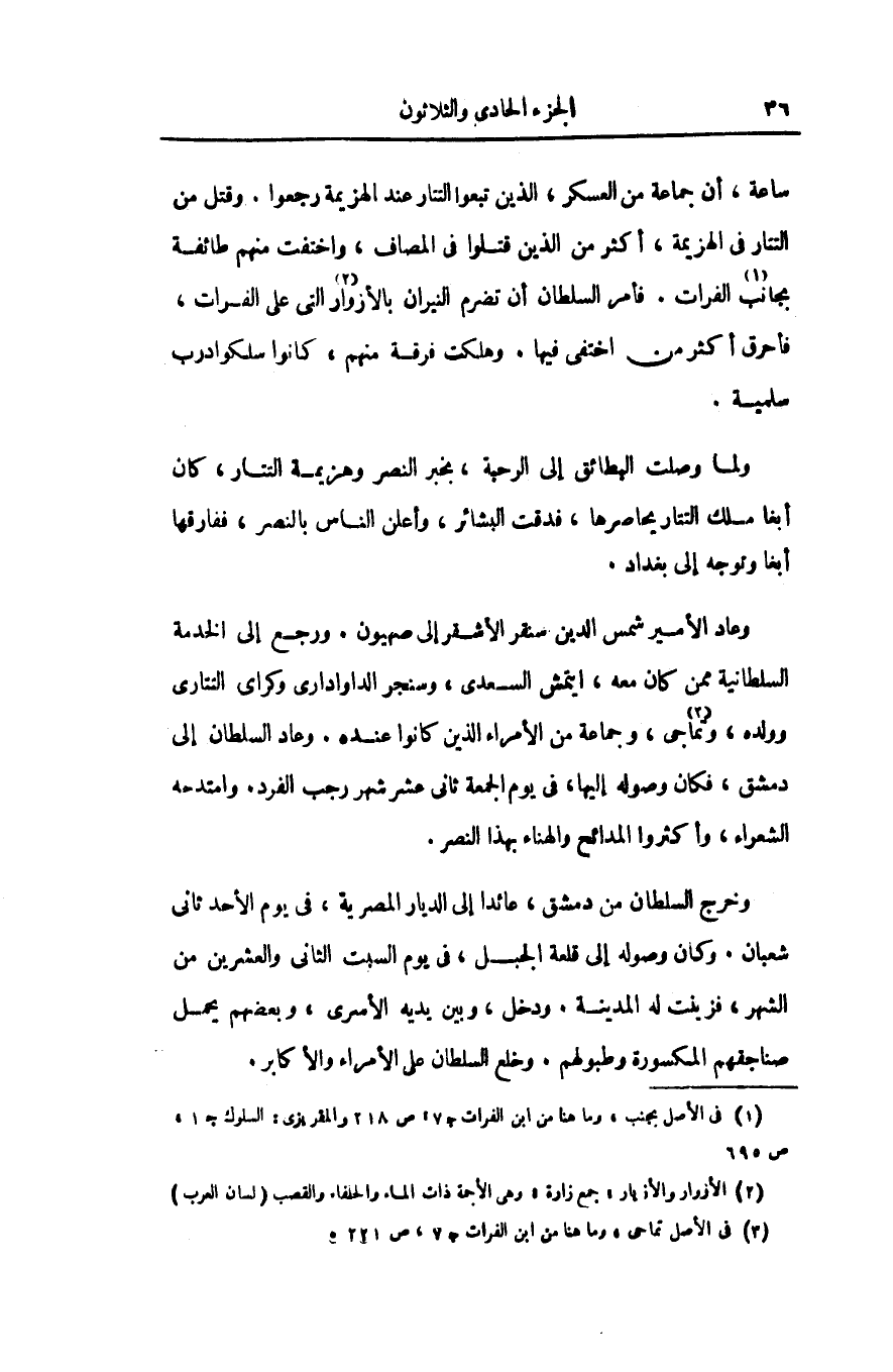 ساعة، أن جماعة من العسكر، الذين تبعوا التتار عند الهزيمة رجعوا. وقتل من التتار فى الهزيمة، أكثر من الذين قتلوا فى المصاف، واختفت منهم طائفة بجانب «1» الفرات. فأمر السلطان أن تضرم النيران بالأزوار «2» التى على الفرات، فأحرق أكثر من اختفى فيها. وهلكت فرقة منهم، كانوا سلكوادرب سلمية.