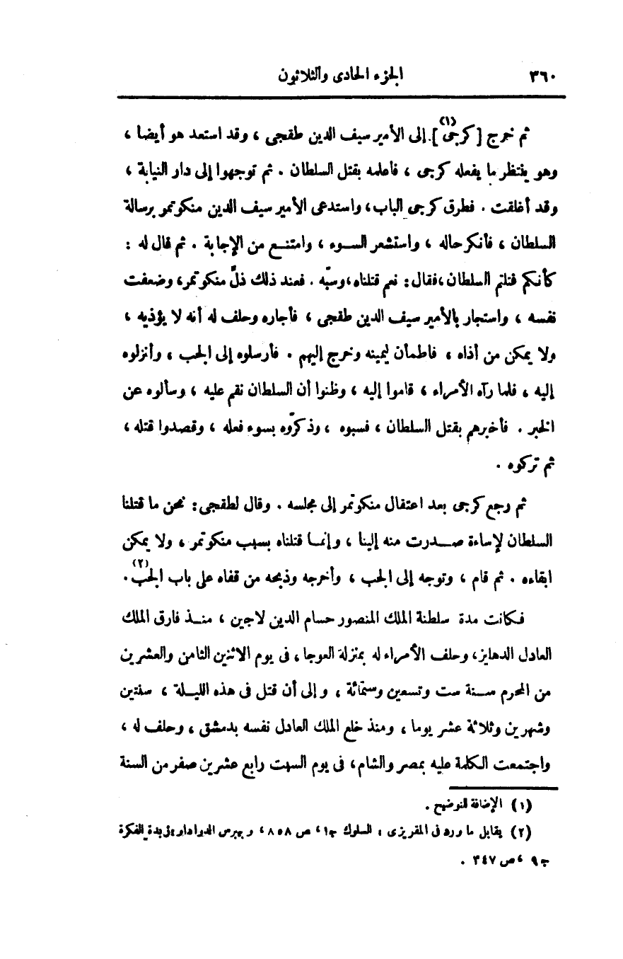 ثم رجع كرجى بعد اعتقال منكوتمر إلى مجلسه. وقال لطقجى: نحن ما قتلنا السلطان لإساءة صدرت منه إلينا، وإنما قتلناه بسبب منكوتمر، ولا يمكن ابقاءه. ثم قام، وتوجه إلى الجب، وأخرجه وذبحه من قفاه على باب الجب «2» .