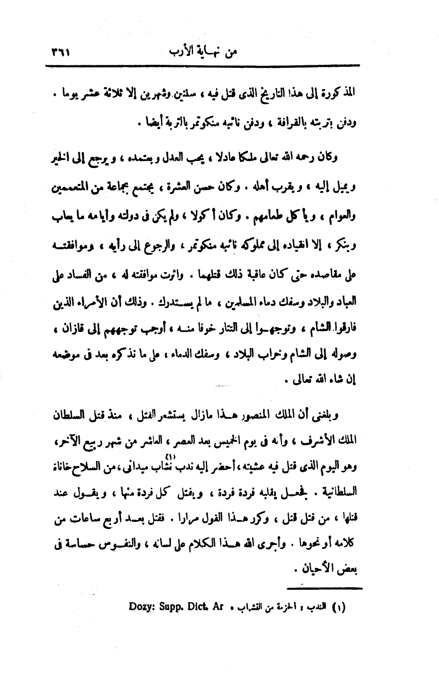 وبلغنى أن الملك المنصور هذا مازال يستشعر القتل، منذ قتل السلطان الملك الأشرف، وأنه فى يوم الخميس بعد العصر، العاشر من شهر ربيع الآخر، وهو اليوم الذى قتل فيه عشيته، أحضر إليه ندب نشاب «1» ميدانى، من السلاح خاناة السلطانية. فجعل يقلبه فردة فردة، ويقتل كل فردة منها، ويقول عند قتلها، من قتل قتل، وكرر هذا القول مرارا. فقتل بعد أربع ساعات من كلامه أو نحوها. وأجرى الله هذا الكلام على لسانه، والنفوس حساسة فى بعض الأحيان.