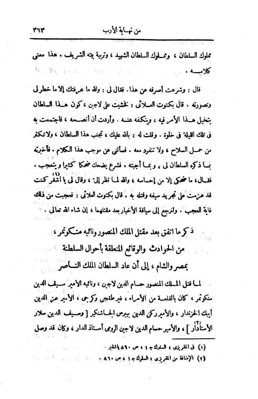ذكر ما اتفق بعد مقتل الملك المنصور ونائبه منكوتمر، من الحوادث والوقائع المتعلقة بأحوال السلطنة بمصر والشام، إلى أن عاد السلطان الملك الناصر