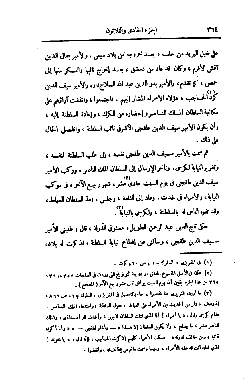 ثم سمت بالأمير سيف الدين طقجى نفسه، إلى طلب السلطنة لنفسه، وتقرير النيابة لكرجى. وتأخر الإرسال إلى السلطان الملك الناصر. وركب الأمير سيف الدين طقجى فى يوم السبت حادى عشر «2» ، شهر ربيع الآخر، فى موكب النيابة، والأمراء فى خدمته. وعاد إلى القلاعة، وجلس. ومدّ السلطان السماط، وقد تفوه الناس له بالسلطنة، ولكرجى بالنيابة «3» .