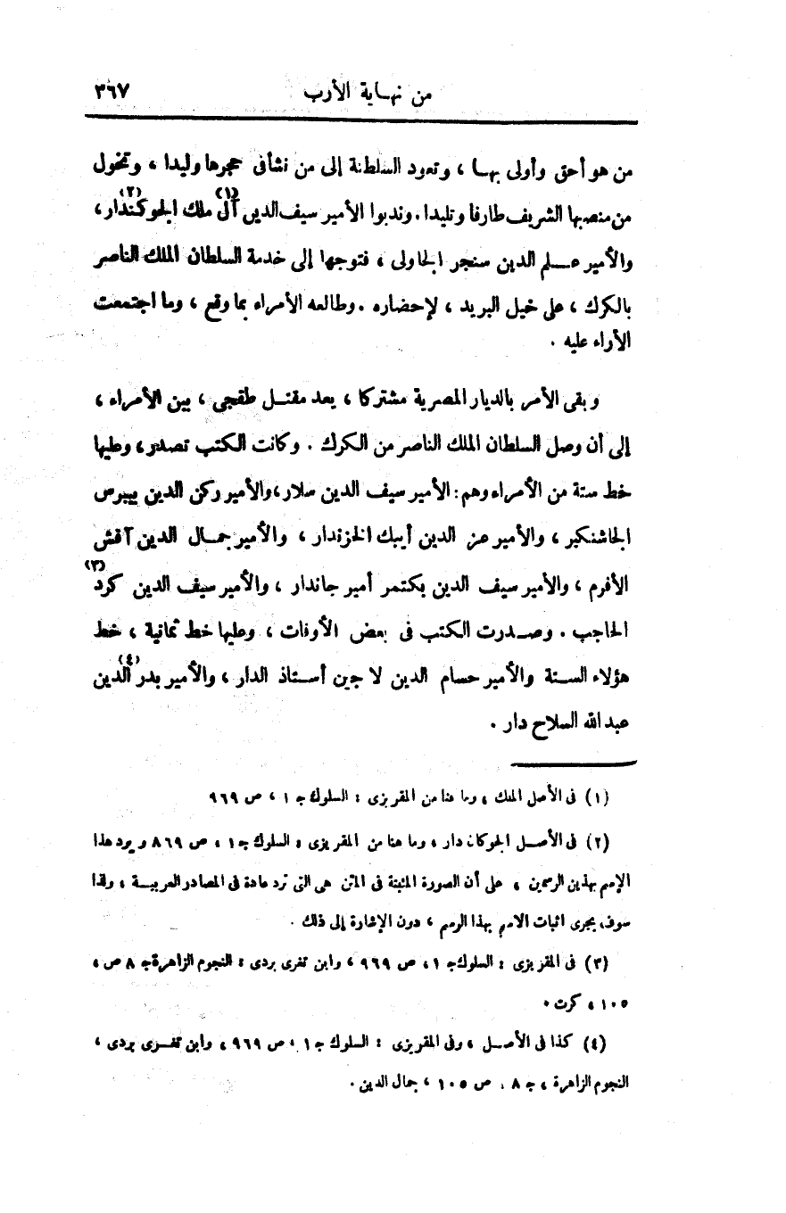 وبقى الأمر بالديار المصرية مشتركا، يعد مقتل طقجى، بين الأمراء، إلى أن وصل السلطان الملك الناصر من الكرك. وكانت الكتب تصدر، وعليها خط ستة من الأمراء وهم: الأمير سيف الدين سلار، والأمير ركن الدين بيبرس الجاشنكير، والأمير عز الدين أيبك الخزندار، والأمير جمال الدين آقش الأفرم، والأمير سيف الدين بكتمر أمير جاندار، والأمير سيف الدين كرد «3» الحاجب. وصدرت الكتب فى بعض الأوفات، وعليها خط ثمانية، خط هؤلاء الستة والأمير حسام الدين لاجين أستاذ الدار، والأمير بدر الدين «4» عبد الله السلاح دار.