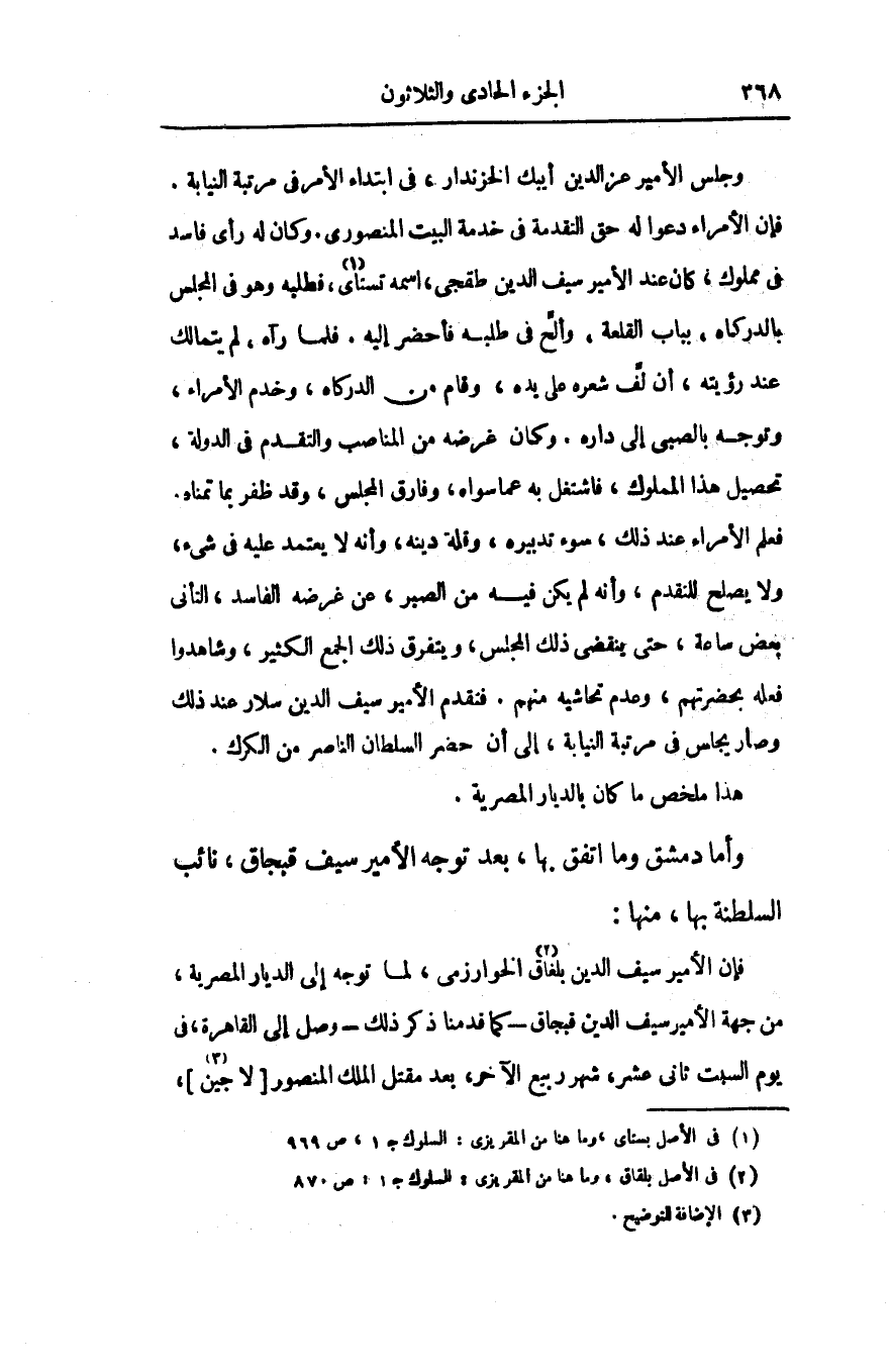 فإن الأمراء دعوا له حق النقدمة فى خدمة البيت المنصورى. وكان له رأى فاسد فى مملوك، كان عند الأمير سيف الدين طقجى، اسمه تستاى «1» ، فطلبه وهو فى المجلس بالدركاه، بباب القلعة، وألحّ فى طلبه فأحضر إليه. فلما رآه، لم يتمالك عند رؤيته، أن لف شعره على يده، وقام من الدركاه، وخدم الأمراء، وتوجه بالصبى إلى داره. وكان غرضه من المناصب والتقدم فى الدولة، تحصيل هذا المملوك، فاشتغل به عما سواه، وفارق المجلس، وقد ظفر بما تمناه، فعلم الأمراء عند ذلك، سوء تدبيره، وقلة دينه، وأنه لا يعتمد عليه فى شىء، ولا يصلح للتقدم، وأنه لم يكن فيه من الصبر، عن غرضه الفاسد، التأنى بعض ساعة، حتى ينقضى ذلك المجلس، ويتفرق ذلك الجمع الكثير، وشاهدوا فعله بحضرتهم، وعدم تحاشيه منهم. فتقدم الأمير سيف الدين سلار عند ذلك وصار يجلس فى مرتبة النيابة، إلى أن حضر السلطان الناصر من الكرك.