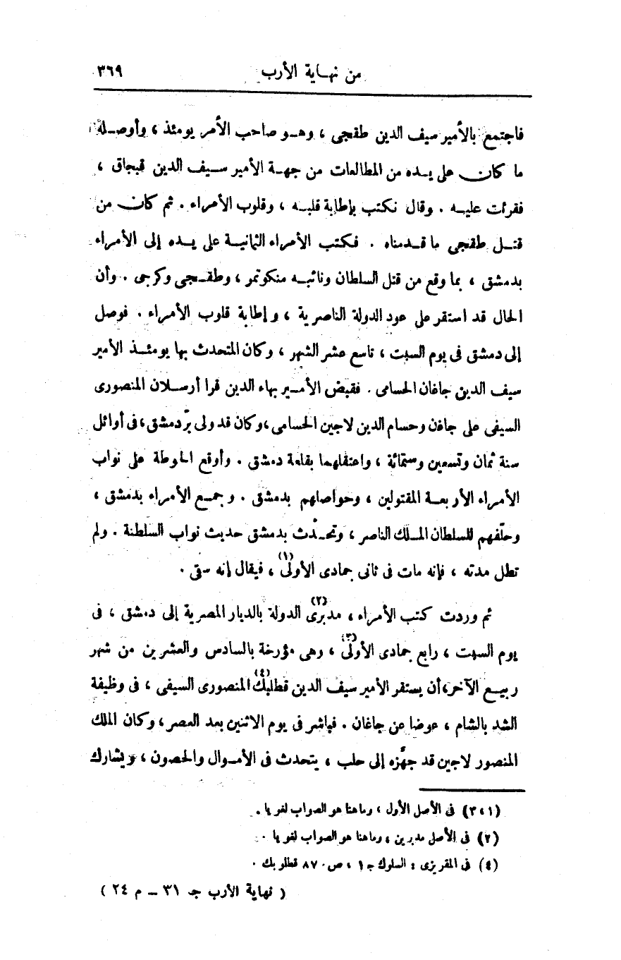 فاجتمع بالأمير سيف الدين طقجى، وهو صاحب الأمر يومئذ، وأوصله ما كان على يده من المطالعات من جهة الأمير سيف الدين قبجاق، فقرئت عليه. وقال نكتب بإطابة قلبه، وقلوب الأمراء. ثم كان من قتل طقجى ما قدمناه. فكتب الأمراء الثمانية على يده إلى الأمراء بدمشق، بما وقع من قتل السلطان ونائبه منكوتمر، وطقجى وكرجى. وأن الحال قد استقر على عود الدولة الناصرية، وإطابة قلوب الأمراء. فوصل إلى دمشق فى يوم السبت، تاسع عشر الشهر، وكان المتحدث بها يومئذ الأمير سيف الدين جاغان والحسامى. فقبض الأمير بهاء الدين قرا أرسلان المنصورى السيفى على جاغان وحسام الدين لاجين الحسامى، وكان قد ولى برّ دمشق، فى أوائل سنة ثمان وتسعين وستمائة، واعتقلهما بقلعة دمشق. وأوقع الحوطة على نواب الأمراء الأربعة المقتولين، وحواصلهم بدمشق. وجمع الأمراء بدمشق، وحلّفهم للسلطان الملك الناصر، وتحدّث بدمشق حديث نواب السلطنة. ولم تطل مدته، فإنه مات فى ثانى جمادى الأولى «1» ، فيقال إنه سقى.