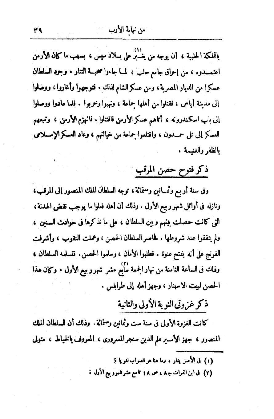 بالمملكة الحلبية، أن يوجه من يغير «1» على بلاد سيس، بسبب ما كان الأرمن اعتمدوه، من إحراق جامع حلب، لما جاءوا صحبة التتار. وجرد السلطان عسكرا من الديار المصربة، ومن عسكر الشام لذلك. فتوجهوا وأغاروا، ووصلوا إلى مدينة أياس، فقتلوا من أهلها جماعة، ونهبوا وخربوا. فلما عادوا ووصلوا إلى باب اسكندرونه، أتاهم عسكر الأرمن فاقتتلوا. فانهزم الأرمن، وتبعهم العسكر إلى تل حمدون، واقتلعوا جماعة من خيالتهم، وعاد العسكر الإسلامى بالظفر والغنيمة.