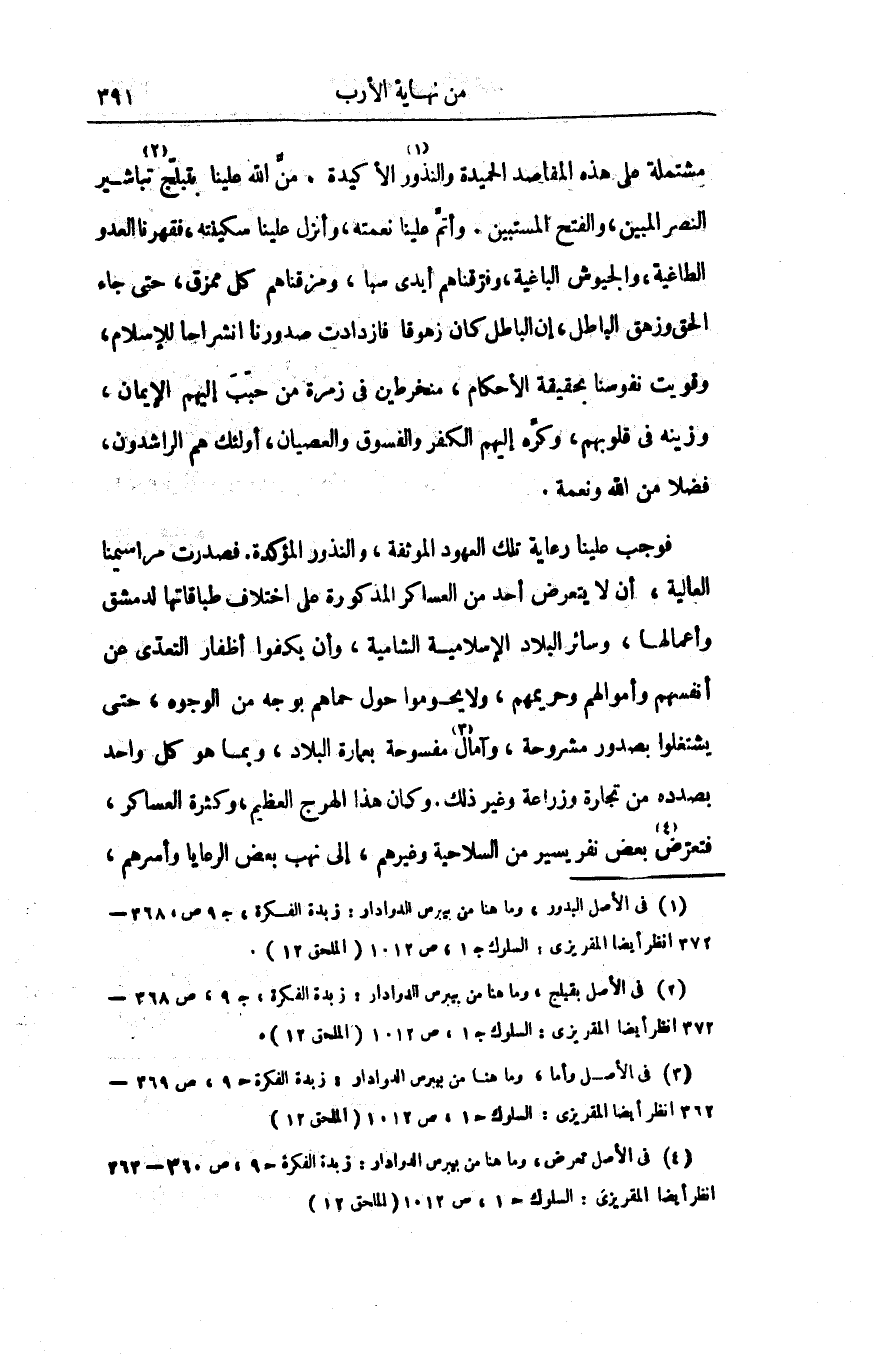 مشتملة على هذه المقاصد الحميدة والنذور «1» الأكيدة. منّ الله علينا بتبلّج «2» تباشير النصر المبين، والفتح المستبين. وأتمّ علينا نعمته، وأنزل علينا سكينته، فقهرنا العدو الطاغية، والجيوش الباغية، وفوّقناهم أيدى سبا، ومزقناهم كل ممزق، حتى جاء الحق وزهق الباطل، إن الباطل كان زهوقا فازدادت صدورنا انشراحا للإسلام، وقويت نفوسنا بحقيقة الأحكام، منخرطين فى زمرة من حبّب إليهم الإيمان، وزينه فى قلوبهم، وكّره إليهم الكفر والفسوق والعصيان، أولئك هم الراشدون، فضلا من الله ونعمة.