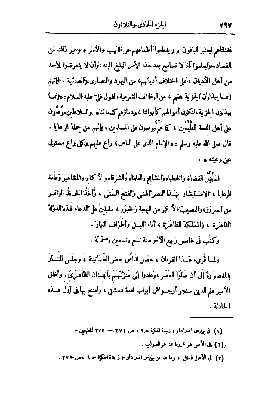 فقتلناهم ليعتبر الباقون، ويقطعوا أطماعهم عن النهب والأسر، وغير ذلك من الفساد. وليعلموا أنا لا نسامح بعد هذا الأمر البليغ البته، وأن لا يتعرضوا لأحد من أهل الأديان، على اختلاف أديانهم، من اليهود والنصارى والصائبة. فإنهم إنما يبذلون الجزية عنهم، من الوظائف الشرعية، لقول علىّ عليه السّلام: «إنما يبذلون الجزية، لتكون أموالهم كأموالنا، ودماؤهم كدمائنا» . والسلاطين موصّون على أهل الذمة الطيعين «1» ، كما هم «2» موصون على المسلمين، فإنهم من جملة الرعايا.