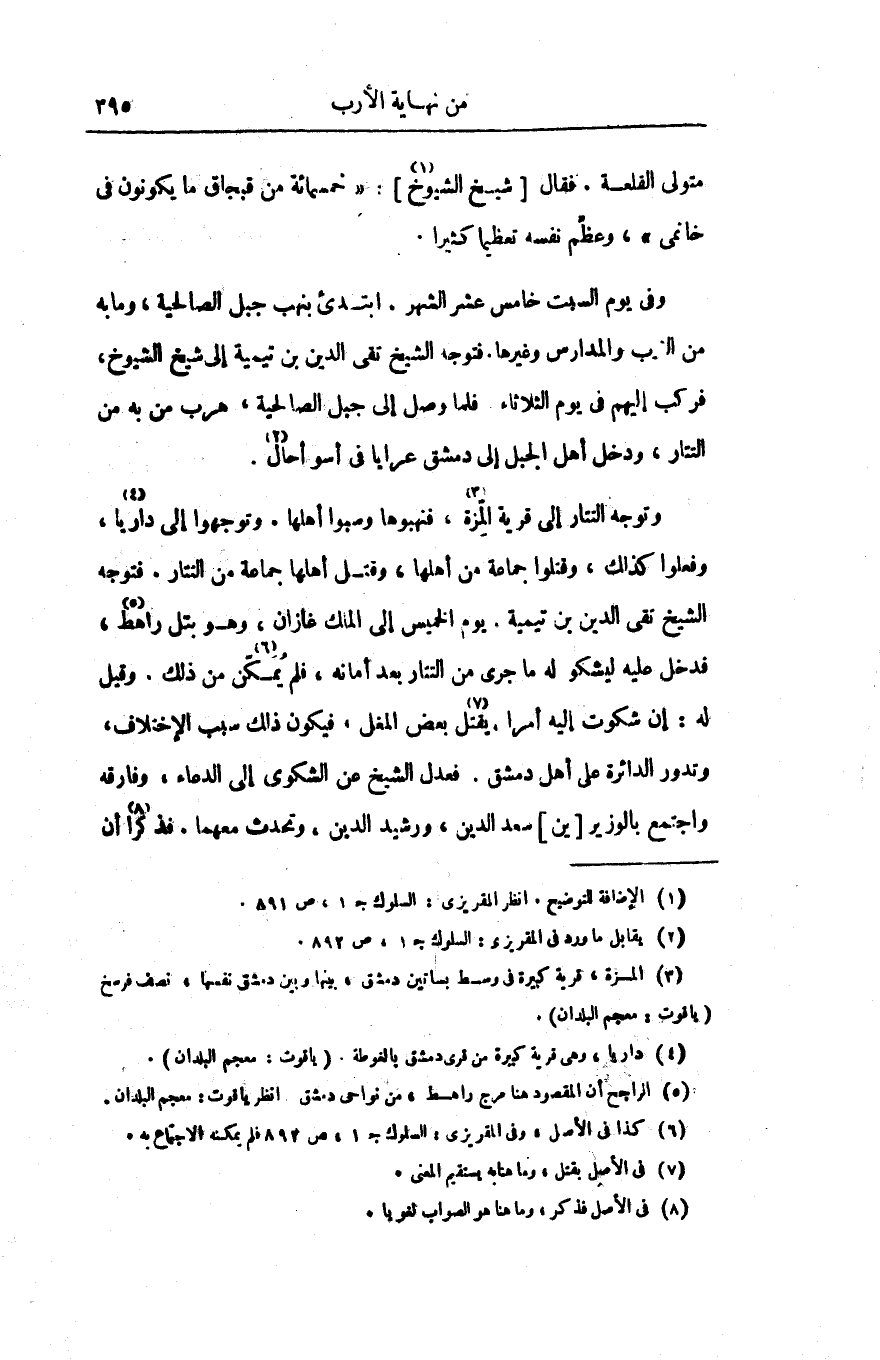 وتوجه التتار إلى قرية المّزة «3» ، فنهبوها وسبوا أهلها. وتوجهوا إلى داريا «4» ، وفعلوا كذلك، وقتلوا جماعة من أهلها، وقتل أهلها جماعة من التتار. فتوجه الشيخ تقى الدين بن تيمية. يوم الخميس إلى الملك غازان، وهو بتل رأهط «5» ، فدخل عليه ليشكو له ما جرى من التتار بعد أمانه، فلم يمكّن «6» من ذلك. وقيل له: إن شكوت إليه أمرا، يقتل «7» بعض المغل. فيكون ذلك سبب الإختلاف، وتدور الدائرة على أهل دمشق. فعدل الشيخ عن الشكوى إلى الدعاء، وفارقه واجتمع بالوزير [ين] سعد الدين، ورشيد الدين، وتحدث معهما. فذكر «8» أن
