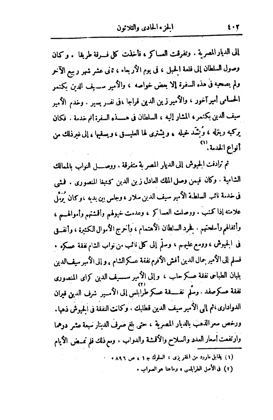فسلم إلى الأمير جمال الدين أقش الأفرم نفقة عسكر الشام، وإلى الأمير سيف الدين بلبان الطباخى نفقة عسكر حلب، وإلى الأمير سيف الدين كراى المنصورى نفقة عسكر صفد. وسلّم نفقة عسكر طرابلس «2» إلى الأمير شرف الدين قيران الدوادارى، ثم إلى الأمير سيف الدين قطلبك. وكانت النفقة فى الجيوش ذهبا.