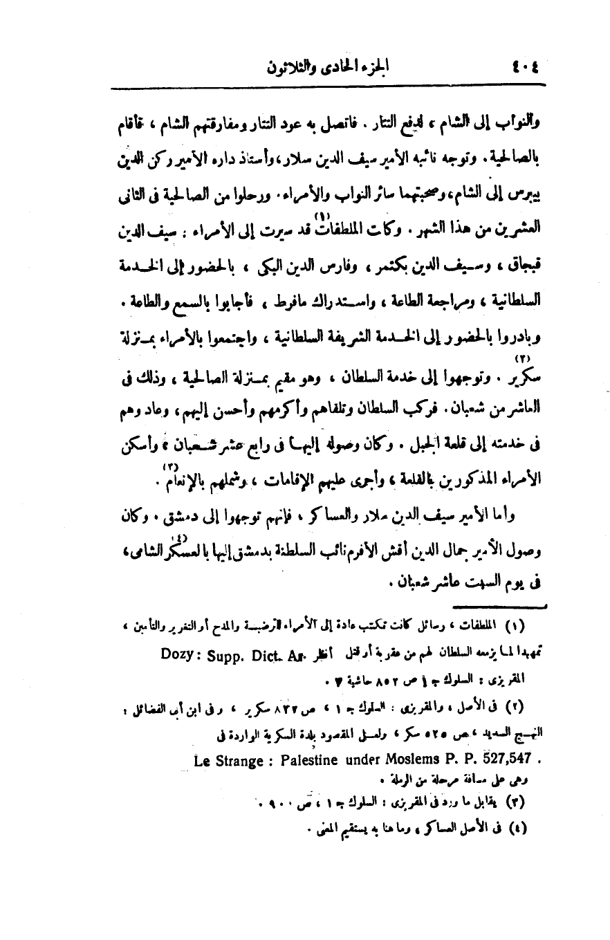 والنواب إلى الشام، لدفع التتار. فاتصل به عود التتار ومفارقتهم الشام، فأقام بالصالحية. وتوجه نائبه الأمير سيف الدين سلار، وأستاذ داره الأمير ركن الدين بيبرس إلى الشام، وصحبتهما سائر النواب والأمراء. ورحلوا من الصالحية فى الثانى العشرين من هذا الشهر. وكانت الملطفات «1» قد سيرت إلى الأمراء: سيف الدين قبجاق، وسيف الدين بكتمر، وفارس الدين البكى، بالحضور إلى الخدمة السلطانية، ومراجعة الطاعة، واستدراك ما فرط، فأجابوا بالسمع والطاعة.