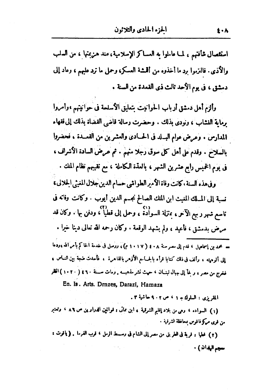 وألزم أهل دمشق أرباب الحوانيت بتعليق الأسلحة فى حوانيتهم، وأمروا برماية النشاب، ونودى بذلك. وحضرت رسالة قاضى القضاة بذلك إلى فقهاء المدارس. وعرض عوام البلد فى الحادى والعشرين من القعدة، فحضروا بالسلاح. وقدم على أهل كل سوق رجلا منهم. ثم عرض السادة الأشراف، فى يوم الخميس رابع عشرين الشهر، بالعدّة الكاملة، مع نقيبهم نظام الملك.