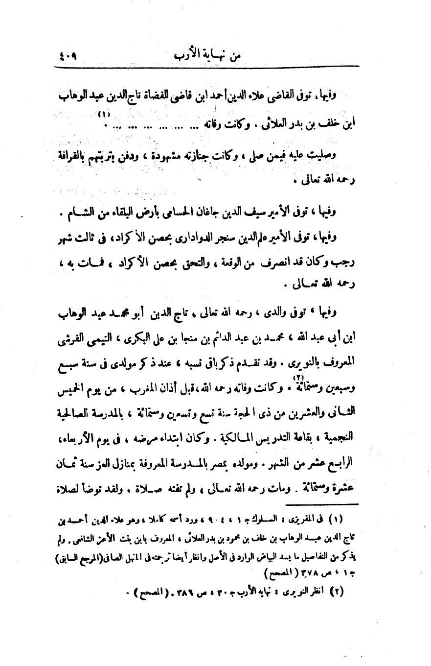 وفيها، توفى والدى، رحمه الله تعالى، تاج الدين أبو محمد عبد الوهاب ابن أبى عبد الله، محمد بن عبد الدائم بن منجا بن على البكرى، النيمى القرشى المعروف بالنويرى. وقد تقدم ذكر باقى نسبه، عند ذكر مولدى فى سنة سبع وسبعين وستمائة «2» . وكانت وفاته رحمه الله، قبل أذان المغرب، من يوم الخميس الثانى والعشرين من ذى الحجة سنة تسع وتسعين وستمائة، بالمدرسة الصالحية النجمية، بقاعة التدريس المالكية. وكان ابتداء مرضه، فى يوم الأربعاء، الرابع عشر من الشهر. ومولده بمصر بالمدرسة المعروفة بمنازل العز سنة ثمان عشرة وستمائة. ومات رحمه الله تعالى، ولم تفته صلاة. ولقد توضأ لصلاة