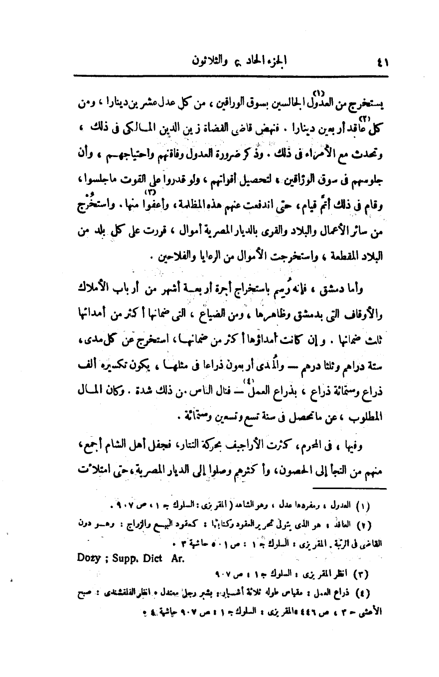 يستخرج من العدول «1» الجالسين بسوق الوراقين، من كل عدل عشرين دينارا، ومن كل «2» عاقد أربعين دينارا. فنهض قاضى القضاة زين الدين المالكى فى ذلك، وتحدث مع الأمراء فى ذلك. وذكر ضرورة العدول وفاقتهم واحتياجهم، وأن جلوسهم فى سوق الوزاقين، لتحصيل أقواتهم، ولو قدروا على القوت ما جلسوا، وقام فى ذلك أتمّ قيام، حتى اندفعت عنهم هذه المظلمة، وأعفوا «3» منها. واستخرج من سائر الأعمال والبلاد والقرى بالديار المصرية أموال، قررت على كل بلد من البلاد المقطعة، واستخرجت الأموال من الرعايا والفلاحين.