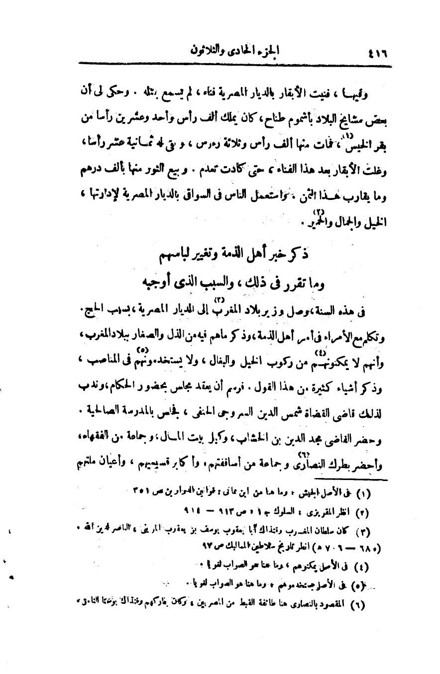 وتكلم مع الأمراء فى أمر أهل الذمة، وذكر ما هم فيه من الذل والصغار ببلاد المغرب، وأنهم لا يمكنونهم «4» من ركوب الخيل والبغال، ولا يستخدمونهم «5» فى المناصب، وذكر أشياء كثيرة من هذا القول. فرسم أن يعقد مجلس بحضور الحكام، وندب لذلك قاضى القضاة شمس الدين السروجى الحنفى، فجلس بالمدرسة الصالحية.