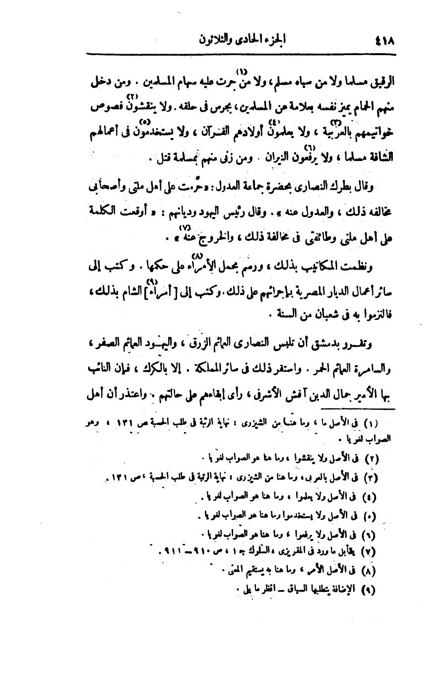 وتقرر بدمشق أن تلبس النصارى العمائم الزرق، واليهود العمائم الصفر، والسامرة العمائم الحمر. واستقر ذلك فى سائر المملكة. إلا بالكرك، فإن النائب بها الأمير جمال الدين آقش الأشرفى، رأى إبقاءهم على حالتهم. واعتذر أن أهل