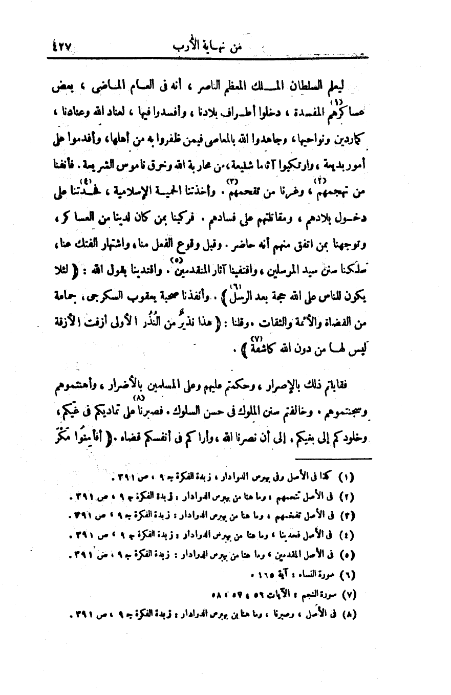 ليعلم السلطان الملك المعظم الناصر، أنه فى العام الماضى، بعض عساكرهم «1» المفسدة، دخلوا أطراف بلادنا، وأفسدوا فيها، لعناد الله وعنادنا، كماردين ونواحيها، وجاهدوا الله بالمعاصى فيمن ظفروا به من أهلها، وأقدموا على أمور بديعة، وارتكبوا آثما شنيعة، من محاربة الله وخرق ناموس الشريعة. فأنفنا من تهجمهم «2» ، وغرنا من تقحمهم «3» . وأخذتنا الحمية الإسلامية، فحدتنا «4» على دخول بلادهم، ومقاتلتهم على فسادهم. فركبنا بمن كان لدينا من العساكر، وتوجهنا بمن اتفق منهم أنه حاضر. وقبل وقوع الفعل منا، واشتهار الفتك عنا، صلكنا سنن سيد المرسلين، واقتفينا آثار المتقدمين «5» . واقتدينا بقول الله: (لِئَلَّا يَكُونَ لِلنَّاسِ عَلَى اللَّهِ حُجَّةٌ بَعْدَ الرُّسُلِ)