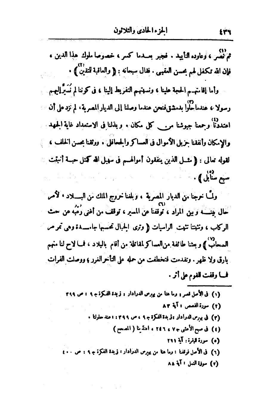 «7» وبعثنا طائفة من العساكر لمقاتلة من أقام بالبلاد، فما لاح لنا منهم بارق ولا ظهر. وتقدمت فتخطفت من حمله على التأخر الغرر؛ ووصلت الفرات فما وقفت للقوم على أثر.