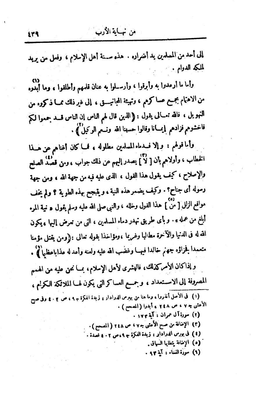 وأما قولهم: وإلا فدماء المسلمين مطلوله، فما كان أغناهم عن هذا الخطاب، وأولاهم بأن [لا «3» ] يصدر إليهم عن ذلك جواب، ومن قصد «4» الصلح والإصلاح، كيف يقول هذا القول، الذى عليه فيه من جهة الله، ومن جهة رسوله أى جناح؟. وكيف يضمر هذه النية، ويتبجح بهذه الطوية؟ ولم يخف مواقع الزلل [من «5» ] هذا القول وخلله، والنبى صلى الله عليه وسلم يقول «نية المرء أبلغ من عمله» . وبأى طريق تهدر دماء المسلمين، التى من تعرض إليها، يكون الله له فى الدنيا والآخرة مطالبا وغريما، ومؤاخذا بقوله تعالى: (وَمَنْ يَقْتُلْ مُؤْمِناً مُتَعَمِّداً فَجَزاؤُهُ جَهَنَّمُ خالِداً فِيها وَغَضِبَ اللَّهُ عَلَيْهِ وَلَعَنَهُ وَأَعَدَّ لَهُ عَذاباً عَظِيماً)