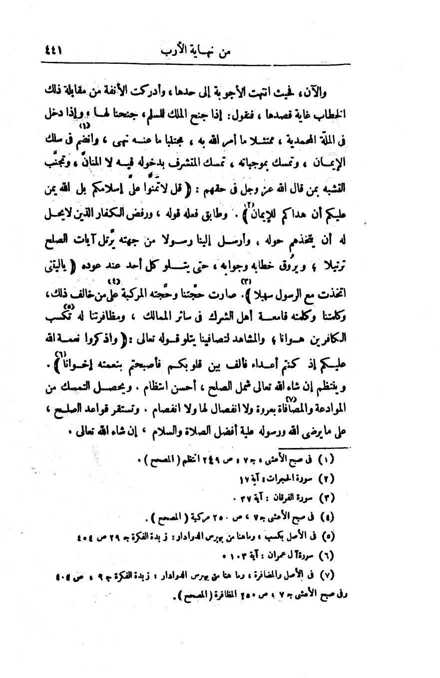 والآن، فحيث انتهت الأجوبة إلى حدها، وأدركت الأنفة من مقابلة ذلك الخطاب غاية قصدها، فنقول: إذا جنح الملك للسلم، جنحنا لها، وإذا دخل فى الملّة المحمدية، ممتثلا ما أمر الله به، مجتنبا ما عنه نهى، وانضم «1» فى سلك الإيمان، وتمسك بموجباته، تمسك المتشرف بدخوله فيه لا المنانّ، وتجنّب التشبه بمن قال الله عز وجل فى حقهم: (قُلْ لا تَمُنُّوا عَلَيَّ إِسْلامَكُمْ بَلِ اللَّهُ يَمُنُّ عَلَيْكُمْ أَنْ هَداكُمْ لِلْإِيمانِ)
