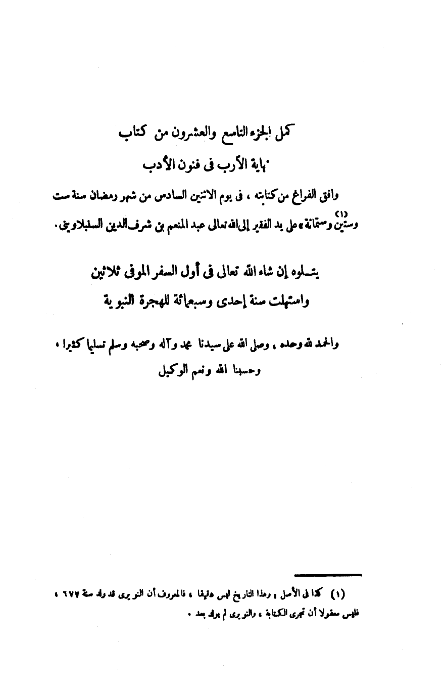 كمل الجزء التاسع والعشرون من كتاب نهاية الآرب فى فنون الأدب وافق الفراغ من كتابته، فى يوم الاثنين السادس من شهر رمضان سنة ست وستين «1» وستمائة» على يد الفقير إلى الله تعالى عبد المنعم بن شرف الدين السنبلاوينى.