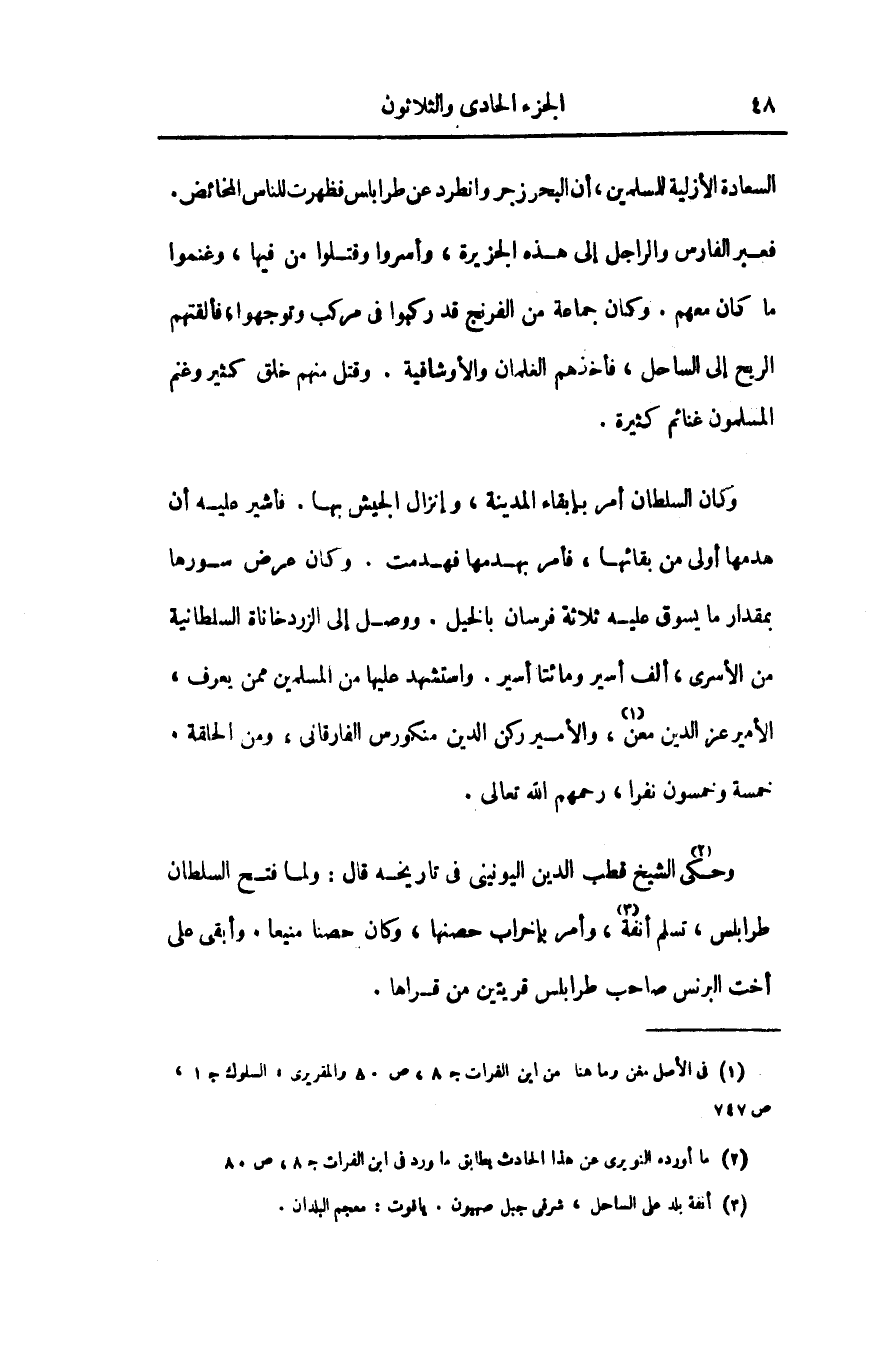 السعادة الأزلية للمسلمين، أن البحر زجر وانطرد عن طرابلس فظهرت للناس المخائض.